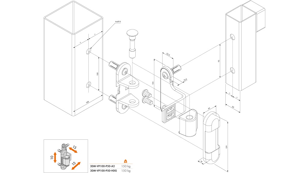 Het scharnier is vervaardigd van roestvrij staal (RVS), wat zorgt voor uitstekende corrosiebestendigheid en langdurige duurzaamheid, zelfs in veeleisende omgevingen. Dankzij de 3D-regelbaarheid kunt u het scharnier aanpassen met 15 mm in de breedte, 10 mm in de hoogte en 10 mm in de diepte, waardoor een perfecte afstelling mogelijk is voor uw poorten.