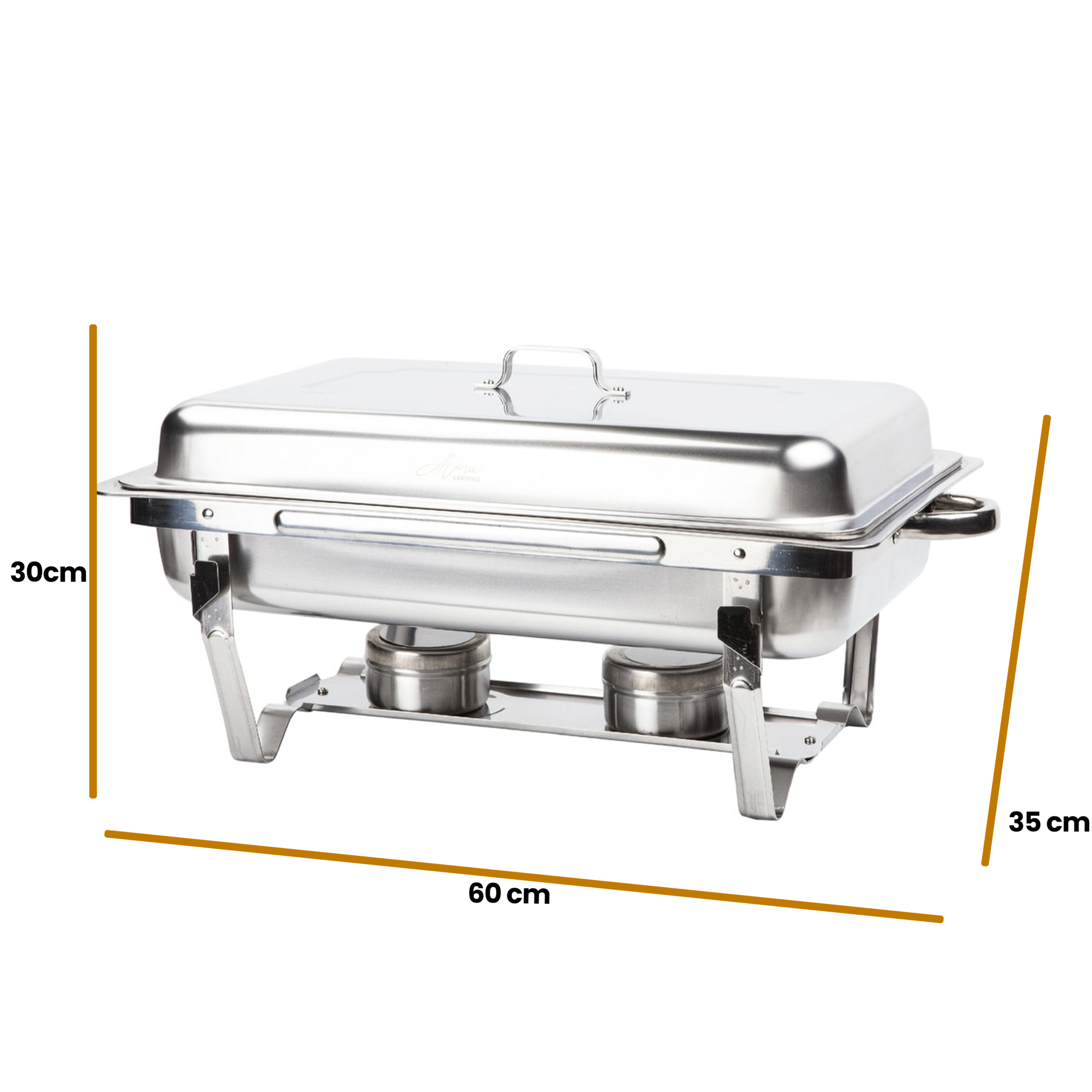 Met zijn strakke, gepolijste design past deze buffetwarmer perfect bij elke gelegenheid, of het nu een intiem etentje is of een groot feest. De buffetwarmer is volledig gemaakt van hoogwaardig roestvrij staal, wat niet alleen corrosievrij is, maar ook bestand tegen langdurige hitte. Dit zorgt ervoor dat de buffetwarmer er langdurig mooi uitziet en lang meegaat.