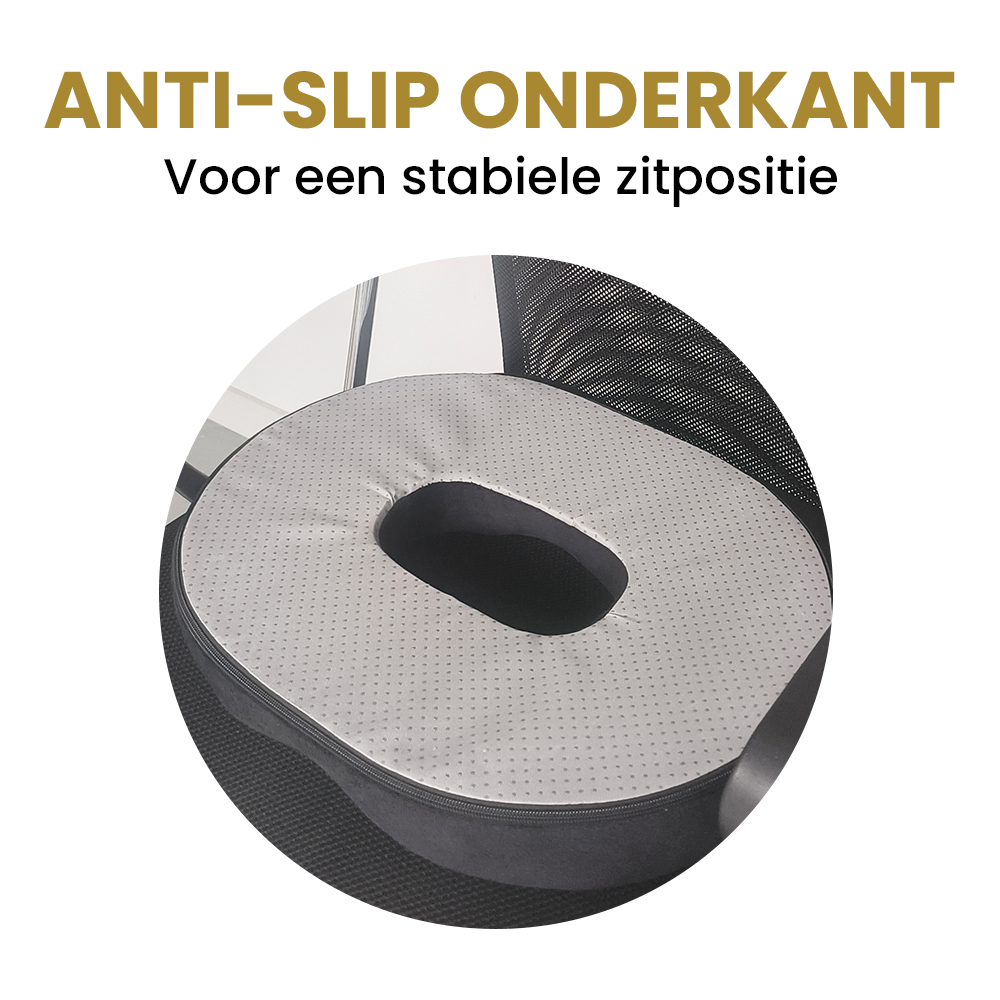 Het speciale donutontwerp zorgt ervoor dat er zo min mogelijk druk op je stuitje komt te staan. In combinatie met de ergonomische vorm bevordert dit een natuurlijke en gezonde zithouding, waardoor je wervelkolom minder wordt belast.