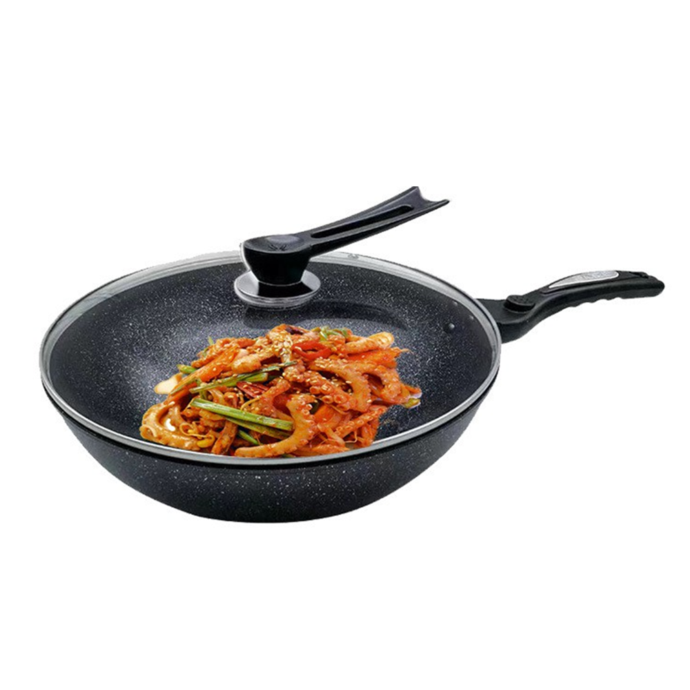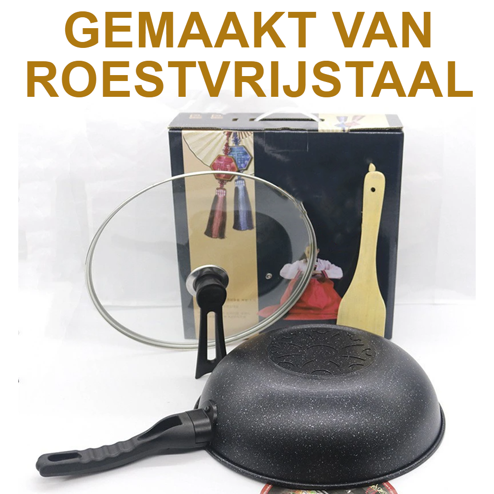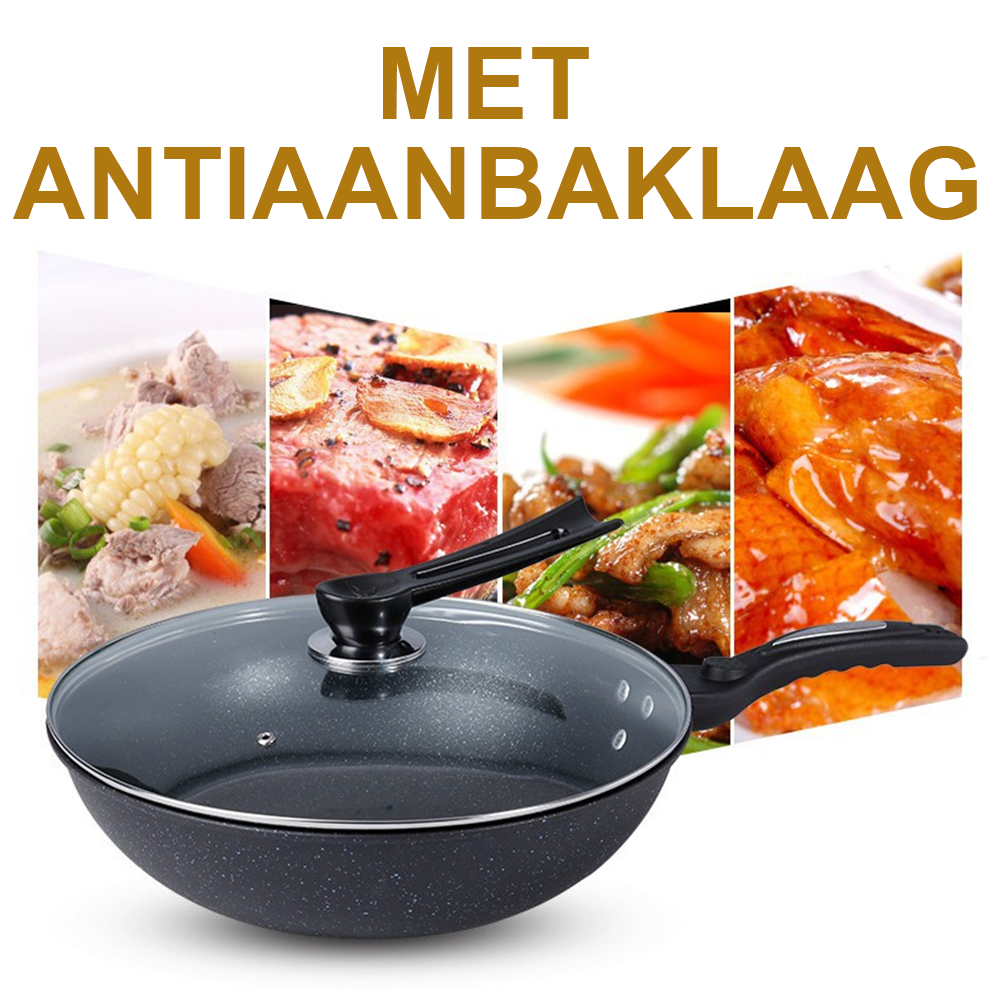 Doordat je weinig olie nodig hebt, is koken in deze wokpan een stuk gezonder dan in een gewone pan. Etensresten laten makkelijk los dankzij de anti-aanbaklaag, en schoonmaken doe je in een handomdraai met een doekje. Liever niet in de vaatwasser plaatsen, zo blijft de pan het langst mooi.