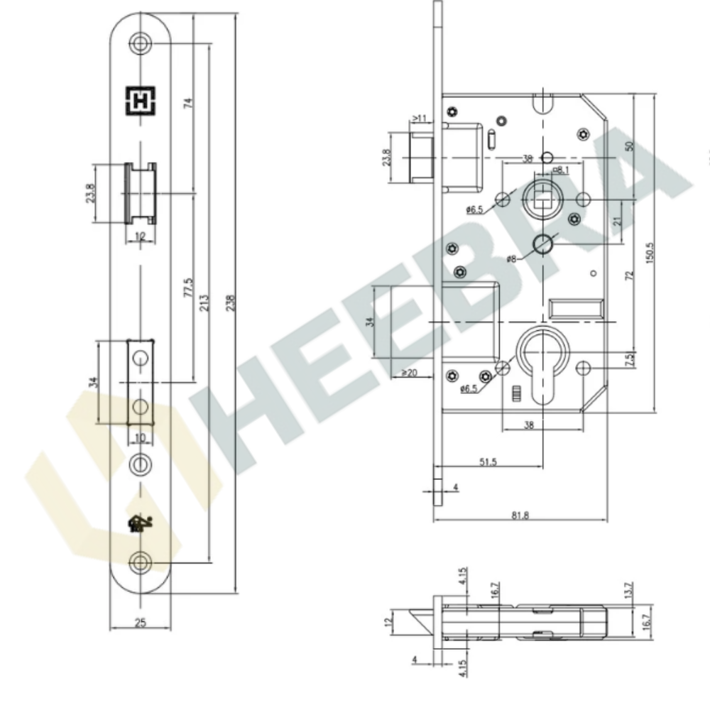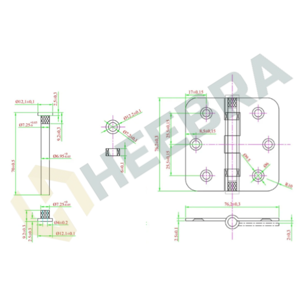 De set is voorzien van een rechthoekig deurbeslag met afgeronde voorplaat en SKG2 veiligheidsnormering. Het cilinderslot (30/30 mm) wordt geleverd met sluitplaat, bevestigingsmateriaal, drie sleutels en montagebout. Daarnaast bevat de set drie standaard scharnieren (76×76 mm) met ronde hoeken, ideaal voor houten poorten met stalen frame.
