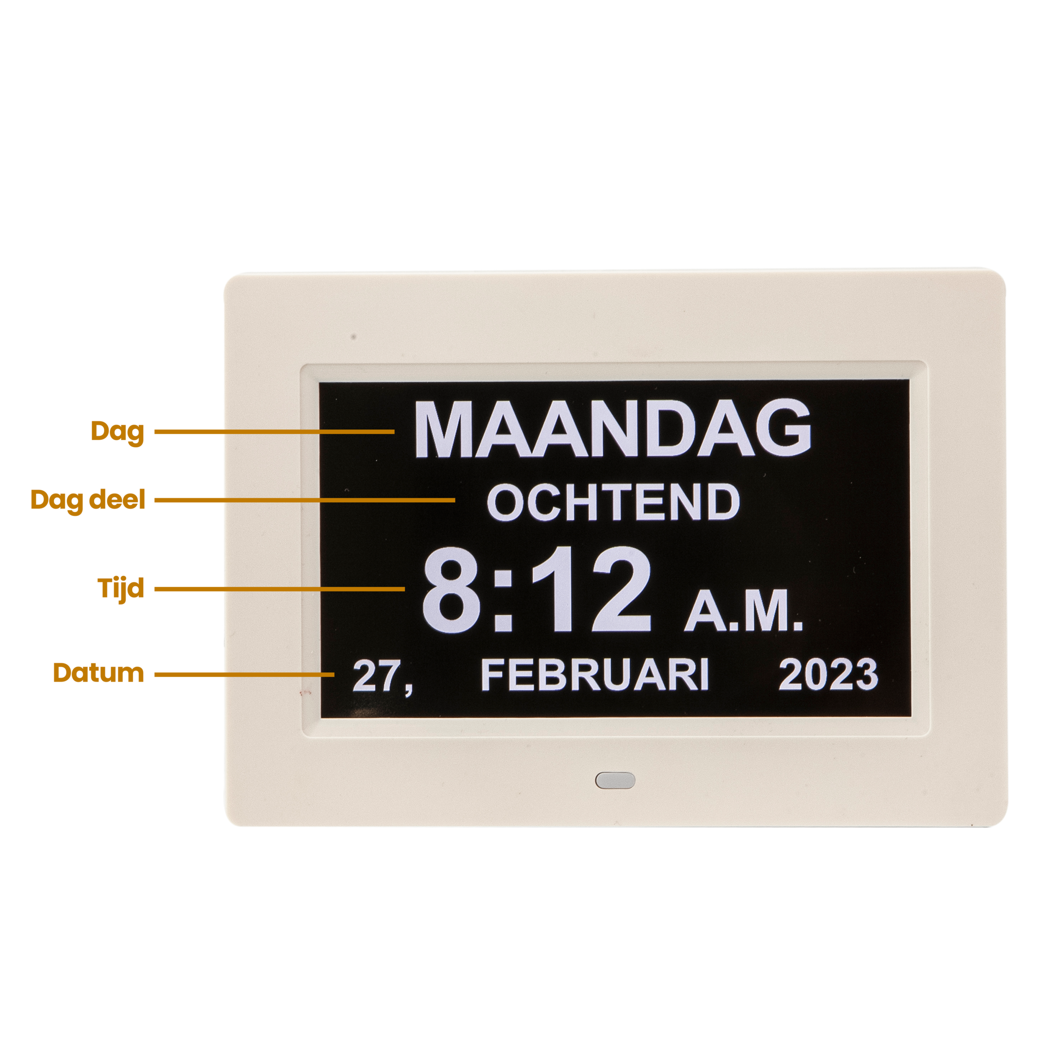 Een buur of geliefde die dementie heeft gekregen? Dan is de digitale dementieklok een handig hulpmiddel! Door het grote display wordt er veel informatie getoond, zoals de huidige tijd, datum en dag. Met de verschillende wekkerfuncties kun je zelfs een medicatiealarm instellen. De klok kan in wel 8 talen worden ingesteld, zo kunnen ook mensen die moeite hebben met de Nederlandse taal de klok perfect gebruiken!