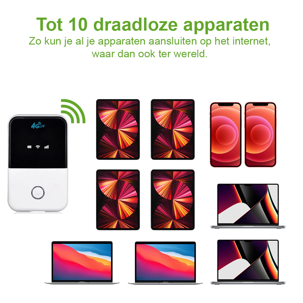 Deze MiFi router is Ideaal op reis, vakantie, camping, strand, boot en op elke andere plek waar geen WiFi is! De router is bedoeld voor iedereen die een trage internetverbinding zat is en graag wil genieten van een veilige en snelle internetverbinding.