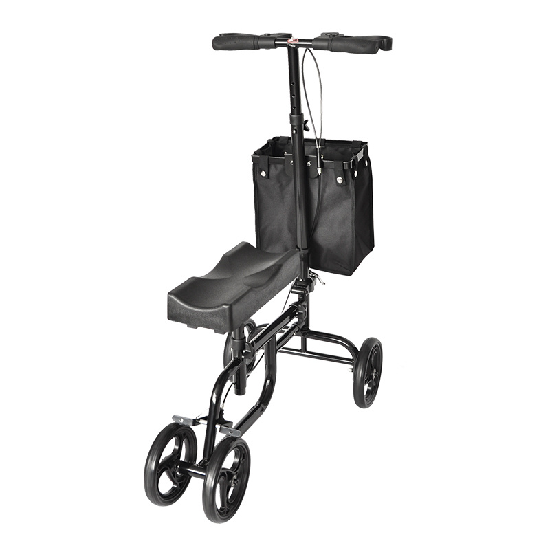 De kniestep is uitgerust met een gedempt knieplatform dat het geblesseerde been of de enkel ondersteunt zonder druk uit te oefenen. De in hoogte verstelbare handgreep (88–112 cm) zorgt voor een ergonomische houding, afgestemd op jouw lengte. Dankzij het lichtgewicht stalen frame en de grote wielen met PVC-coating rijd je soepel en veilig, zowel binnen als buiten.