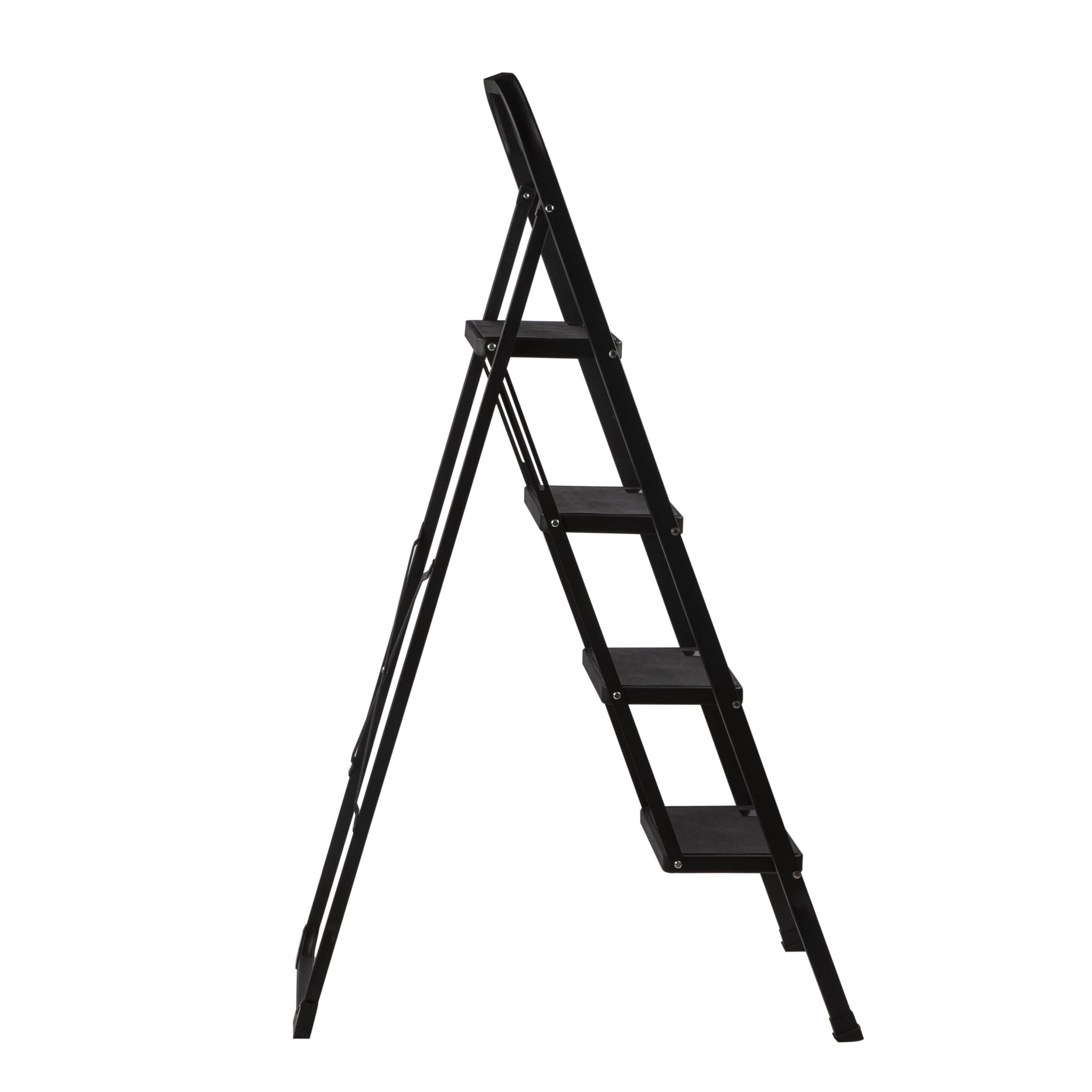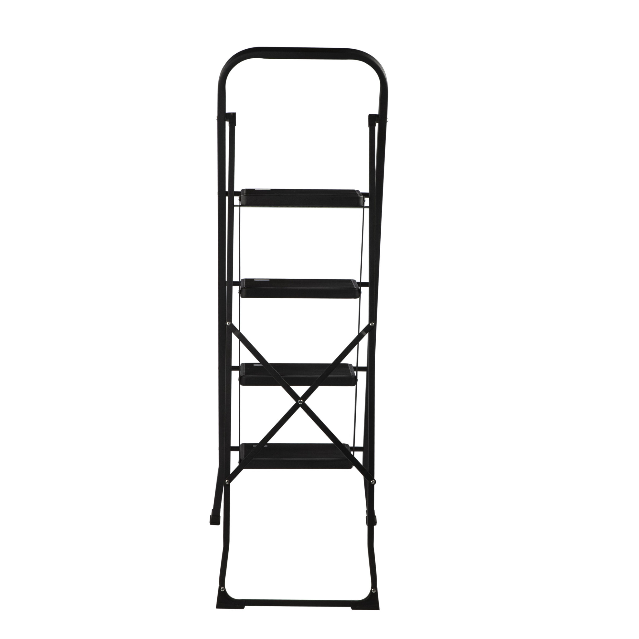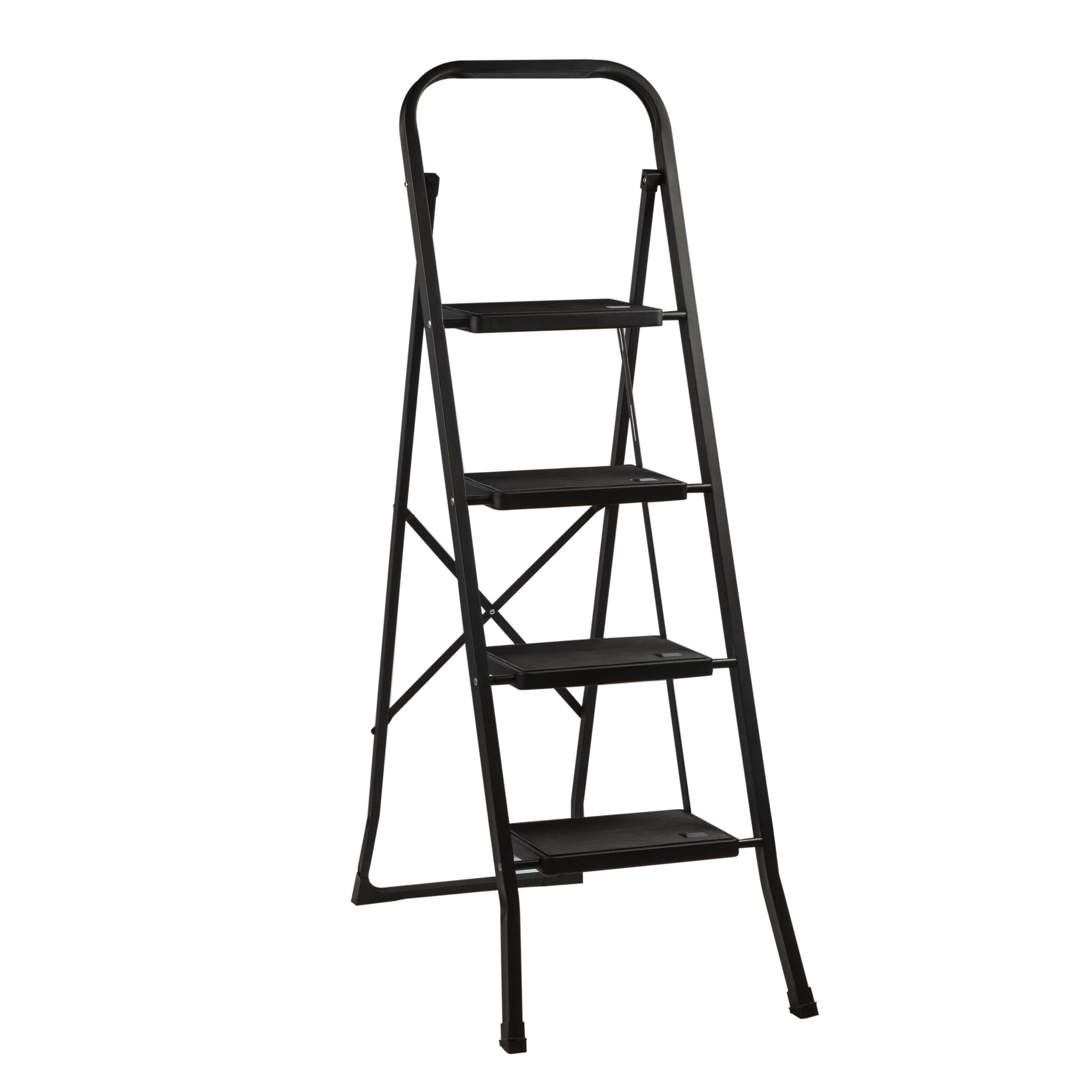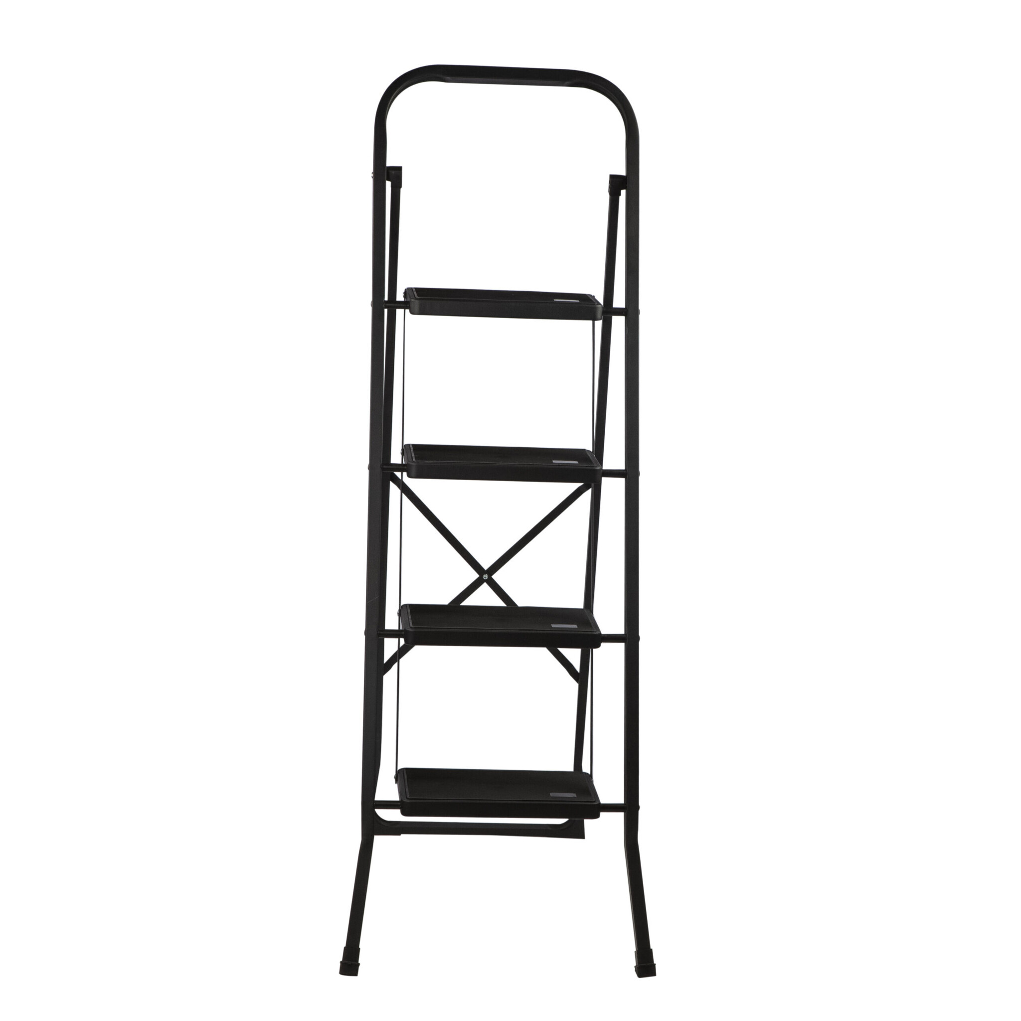 De keukentrap is inklapbaar met 4 zwarte treden. De bovenste treden heeft een hoogte van 93 cm. De trap is inklapbaar en heeft een gewicht van 7.6kg. De keukentrap is voorzien van anti-slip poten en antislipbekleding op de treden. Het maximale draagvermogen van de keukentrap is 150kg.
