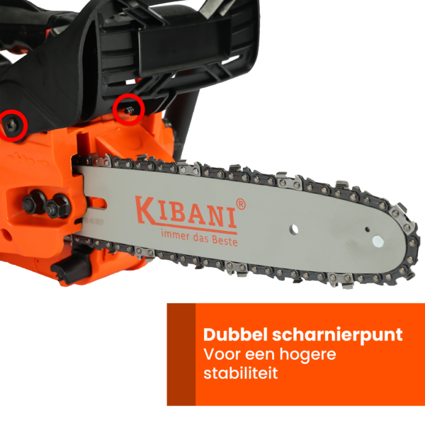 Deze Kibani kettingzaag is voorzien van een extra scharnierpunt bij de remhendel. Dit zorgt ervoor dat de remhendel in tegenstelling tot vergelijkbare modellen een stuk steviger is waardoor deze niet afbreekt en een stuk stabieler is.