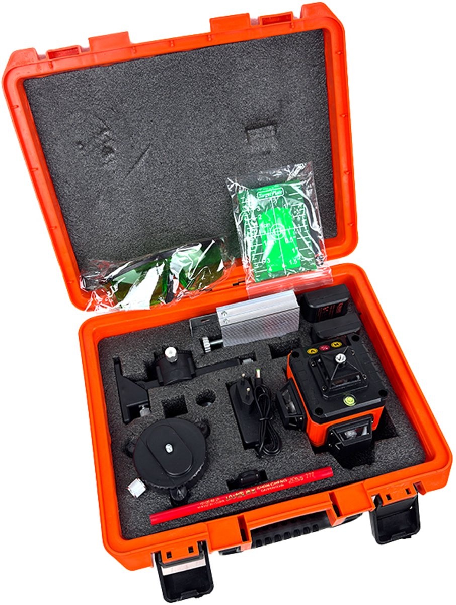 Deze kruislijnlaser wordt geleverd met een volledige accessoireset, inclusief statief, magnetische houder, doelplaat en draagkoffer – alles wat je nodig hebt voor direct gebruik op de werkplek. De duurzame behuizing is schokbestendig en stofdicht, wat zorgt voor een lange levensduur en betrouwbaarheid onder zware werkomstandigheden.