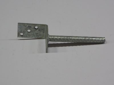 Een L-vormige paaldrager is een stalen verbindingsstuk dat een houten paal stevig verankert aan een betonnen ondergrond. Het betonijzer zorgt voor een stabiele verankering in een betonpoer of funderingsblok, terwijl het L-profiel de paal ondersteunt en op zijn plek houdt.