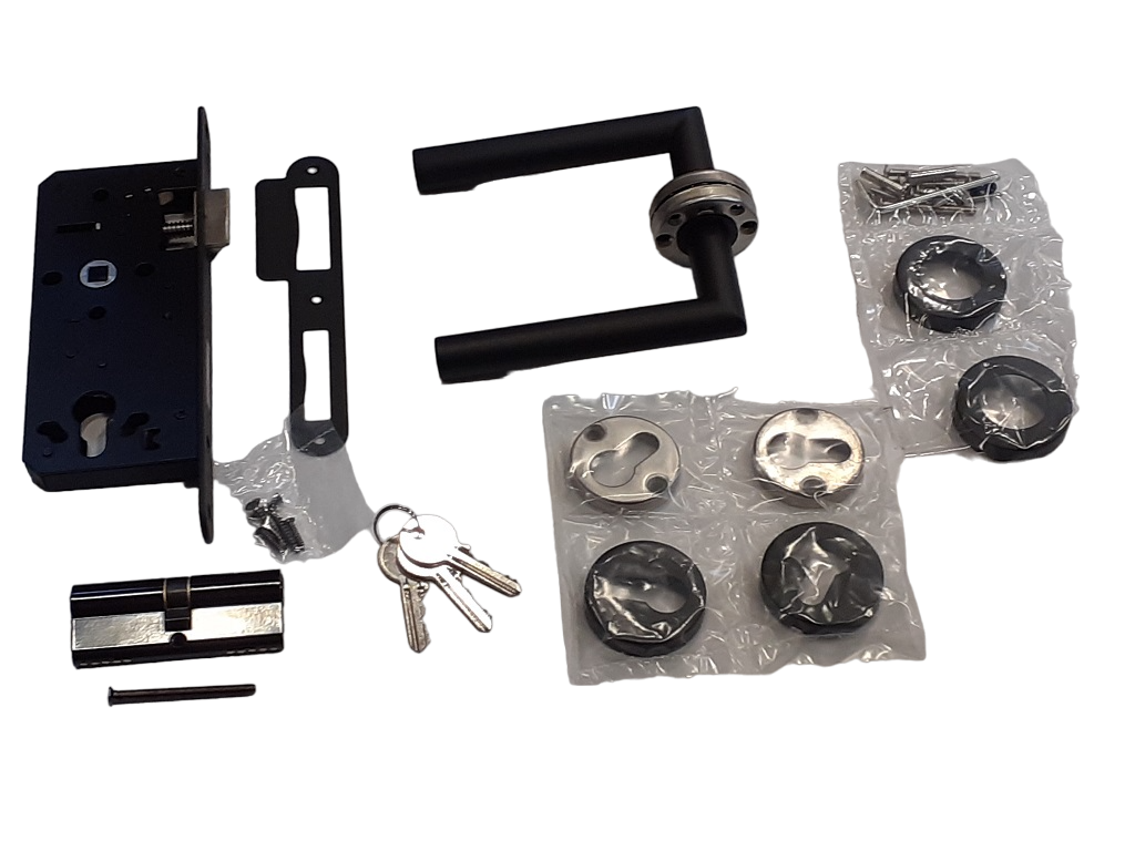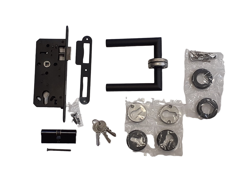 Deze complete tuindeurslotset biedt alles wat u nodig heeft voor een veilige en stijlvolle afwerking van uw tuindeuren. De set is geschikt voor zowel links- als rechtshangende deuren en heeft een slotkast van 72x165 mm, een doornmaat van 45 mm en een PC-maat van 72 mm. De voorplaat en sluitplaat zijn vervaardigd van roestvrij staal en afgewerkt in een elegante zwarte structuurcoating, passend bij de RVS deurkruk en rozetten in dezelfde moderne stijl. De 40/40 cilinder wordt geleverd met drie sleutels, en de 2-toerige nachtschoot zorgt voor extra veiligheid. Perfect voor een strakke en duurzame afwerking van tuindeuren.