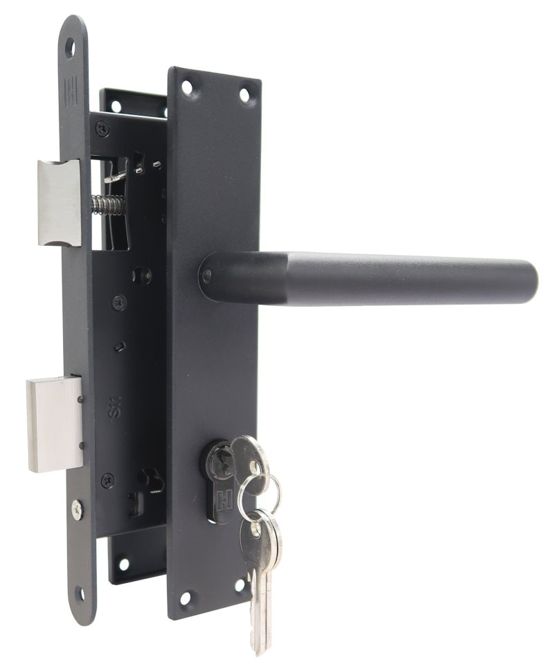 Deze complete set voor tuindeuren is uitgevoerd in roestvrij staal (RVS) en biedt zowel stijl als functionaliteit. De set bevat een dag- en nachtslot, een zwarte cilinder van 35x35 mm met drie bijbehorende sleutels, en een RVS deurschild en deurkruk, afgewerkt met een zwarte structuurcoating voor een moderne uitstraling. De slotkast heeft een afmeting van 72x165 mm, een doornmaat van 45 mm en een PC-maat van 72 mm. Voor extra veiligheid is het slot voorzien van een dubbele nachtstoot, wat zorgt voor extra bescherming tegen ongewenste toegang. Ideaal voor stevige en veilige tuindeuren.