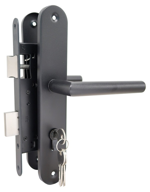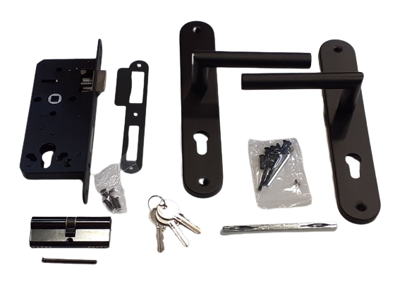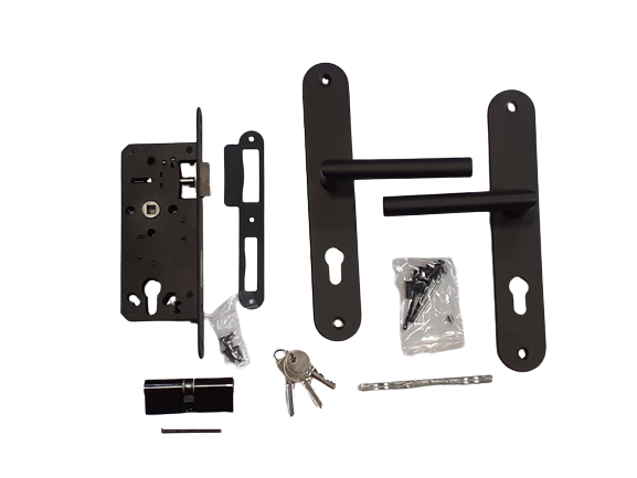 Deze hoogwaardige set voor tuindeuren is geschikt voor zowel links- als rechtshangende deuren en combineert een modern ontwerp met duurzame materialen. De set bevat een cilinder van 40x40 mm met drie sleutels voor optimale beveiliging. Het RVS deurschild en de deurkruk zijn afgewerkt met een stijlvolle zwarte structuurcoating. De slotkast heeft een afmeting van 72x165 mm, een doornmaat van 45 mm en een PC-maat van 72 mm. Dankzij de dubbele nachtstoot biedt deze set extra stabiliteit en betrouwbaarheid.