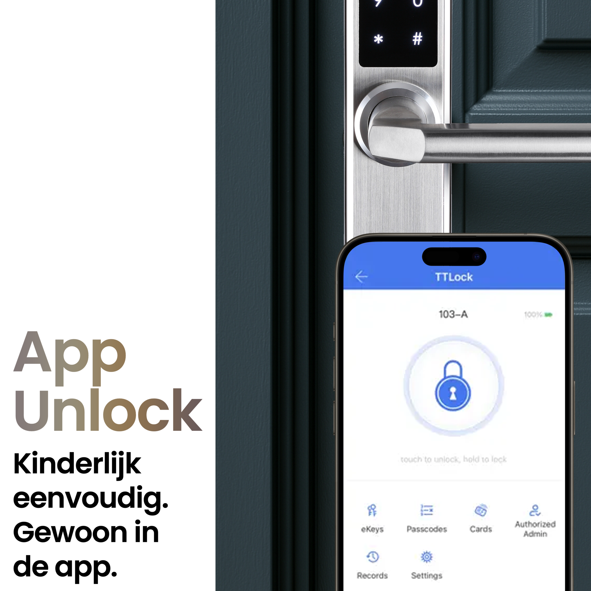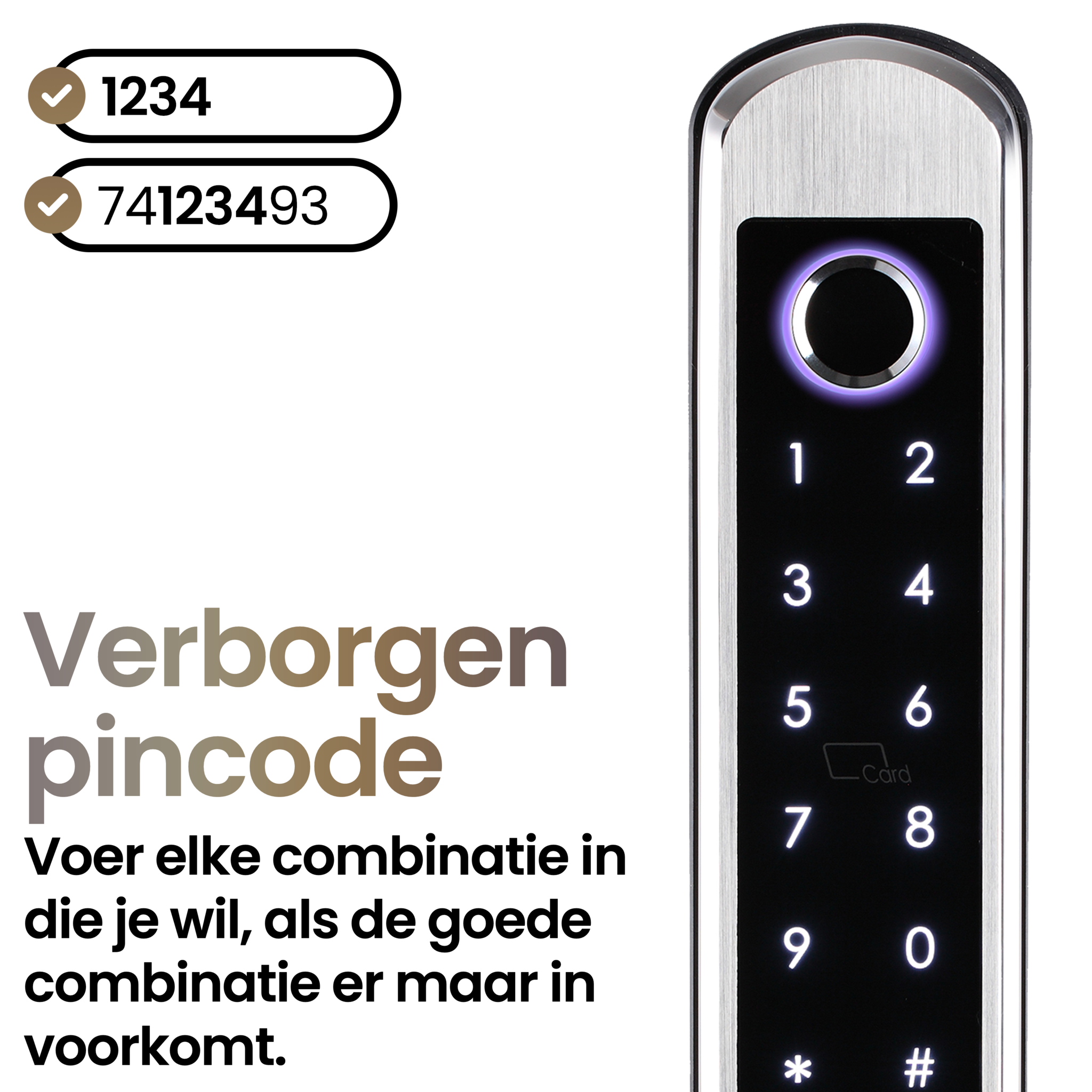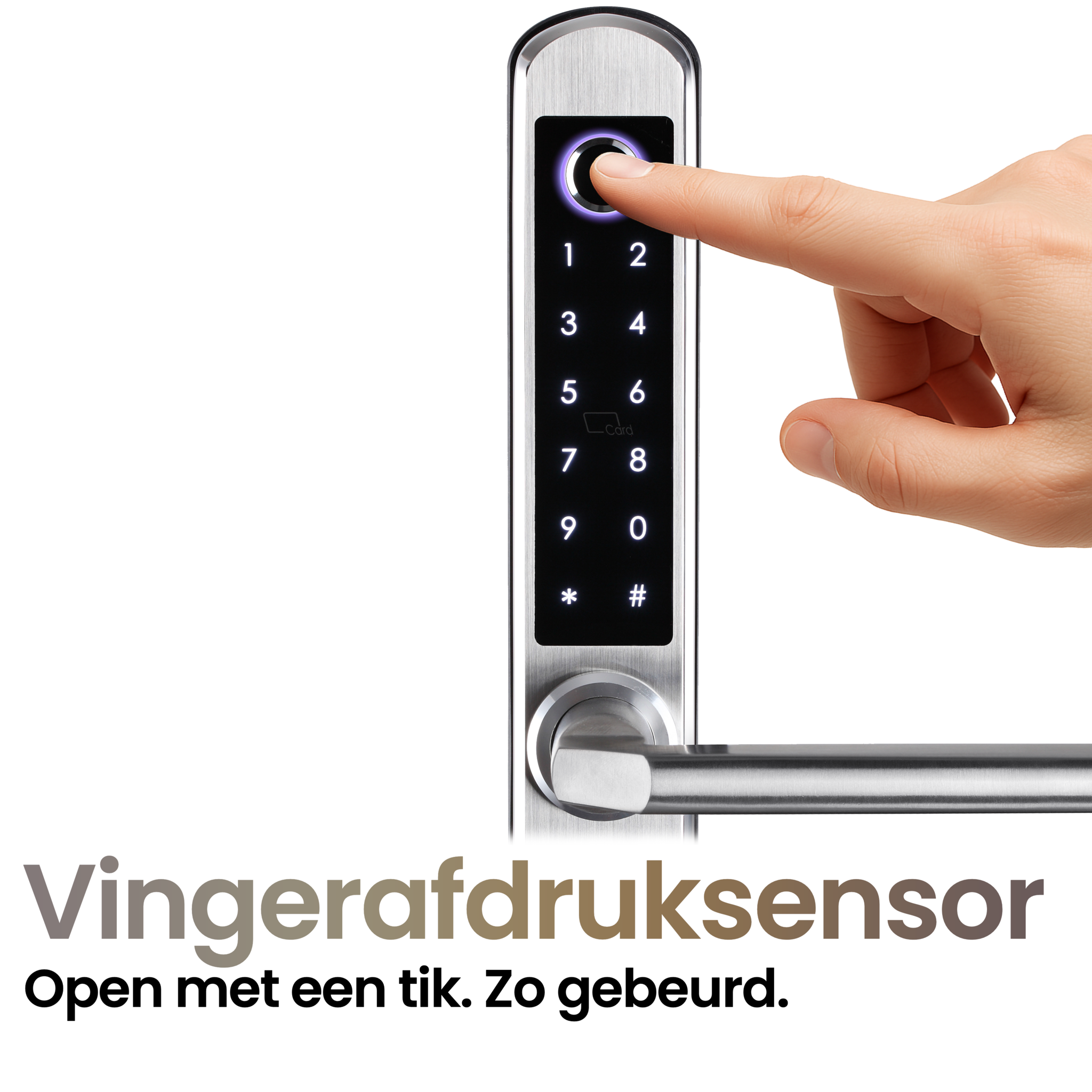 Je kunt dit slimme slot ontgrendelen op vijf verschillende manieren. Pincode. Vingerafdruk. Mobiele app. Kaartscan. Fysieke sleutel.