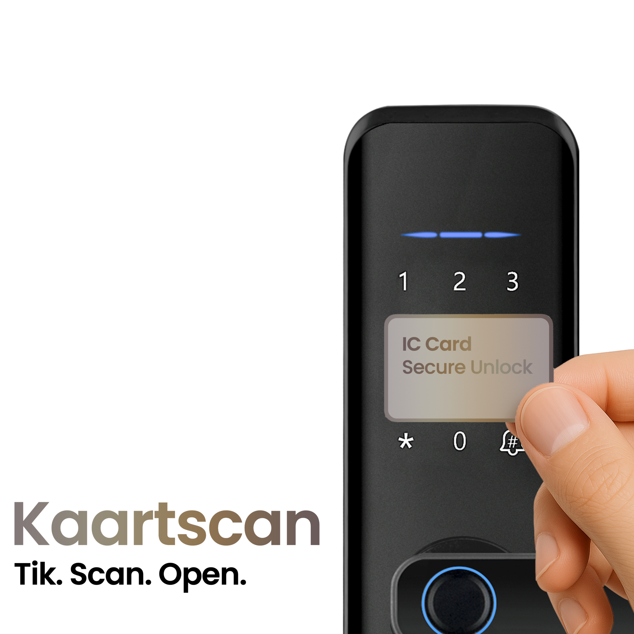 5 toegangsopties: pincode, vingerafdruk, mobiele app, kaartscan en fysieke sleutel.