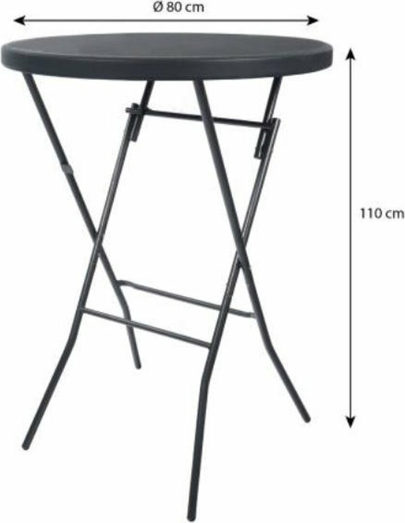 * Set van 2 statafels * Hoogte: 110 cm * Afmeting blad: Ø80 cm * Materiaal frame: gepoedercoat staal * Materiaal blad: kunststof * Afmeting ingeklapt: 78.5x6x137 cm (LxBxH) * Gewicht statafel: 7.9 kg * Afmeting verpakking: 84x12x140 cm (LxBxH) * Gewicht verpakking: 19 kg * Één jaar garantie