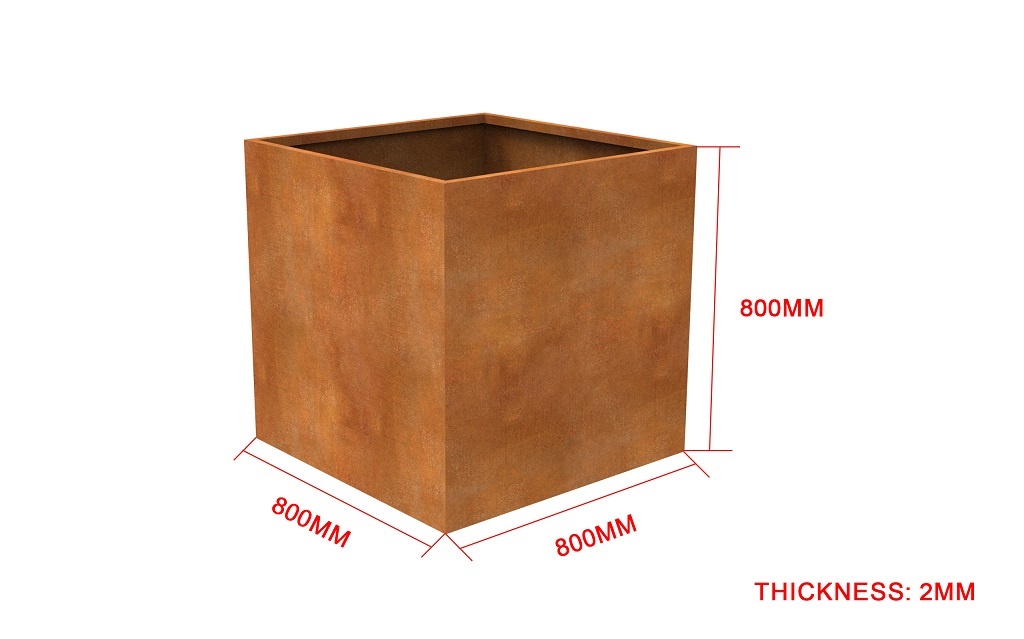 De Vierkante Plantenbak 800x800x800 mm is een robuuste en stijlvolle keuze voor tuin, terras of entree. De plantenbak is vervaardigd uit duurzaam cortenstaal, een materiaal dat door natuurlijke oxidatie een warme roestkleur ontwikkelt. Deze oxidelaag beschermt het staal tegen doorroesten, waardoor de plantenbak jarenlang meegaat zonder onderhoud.