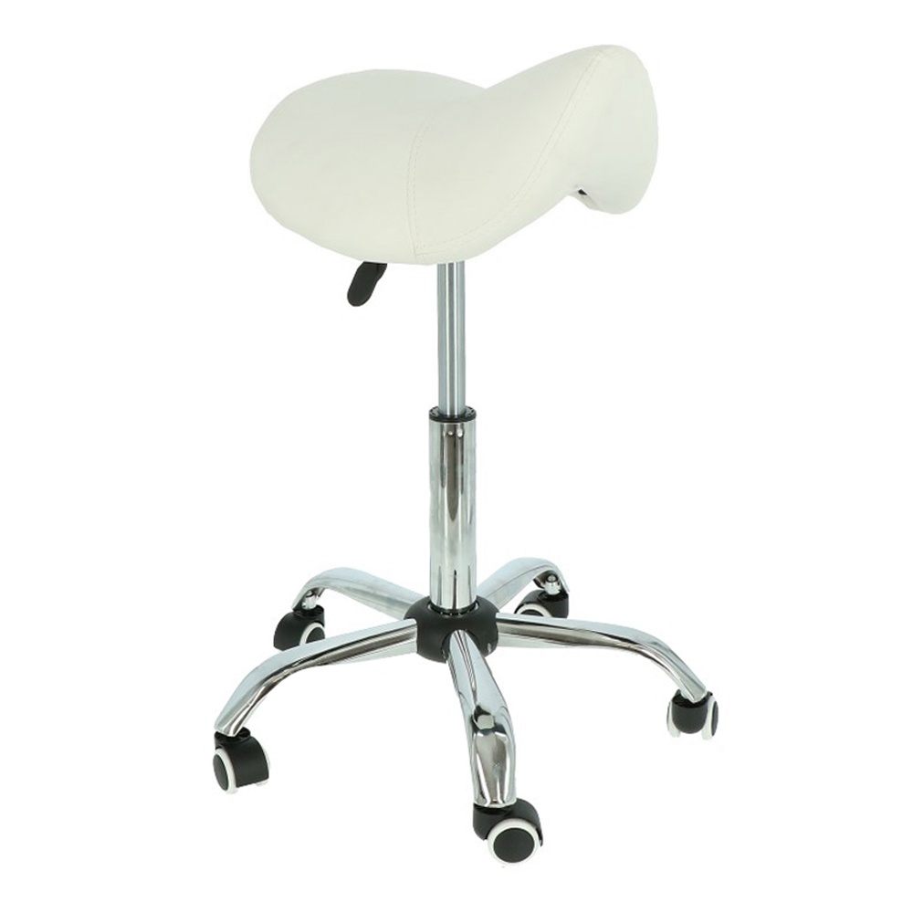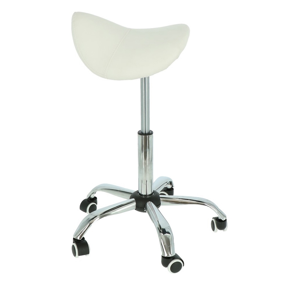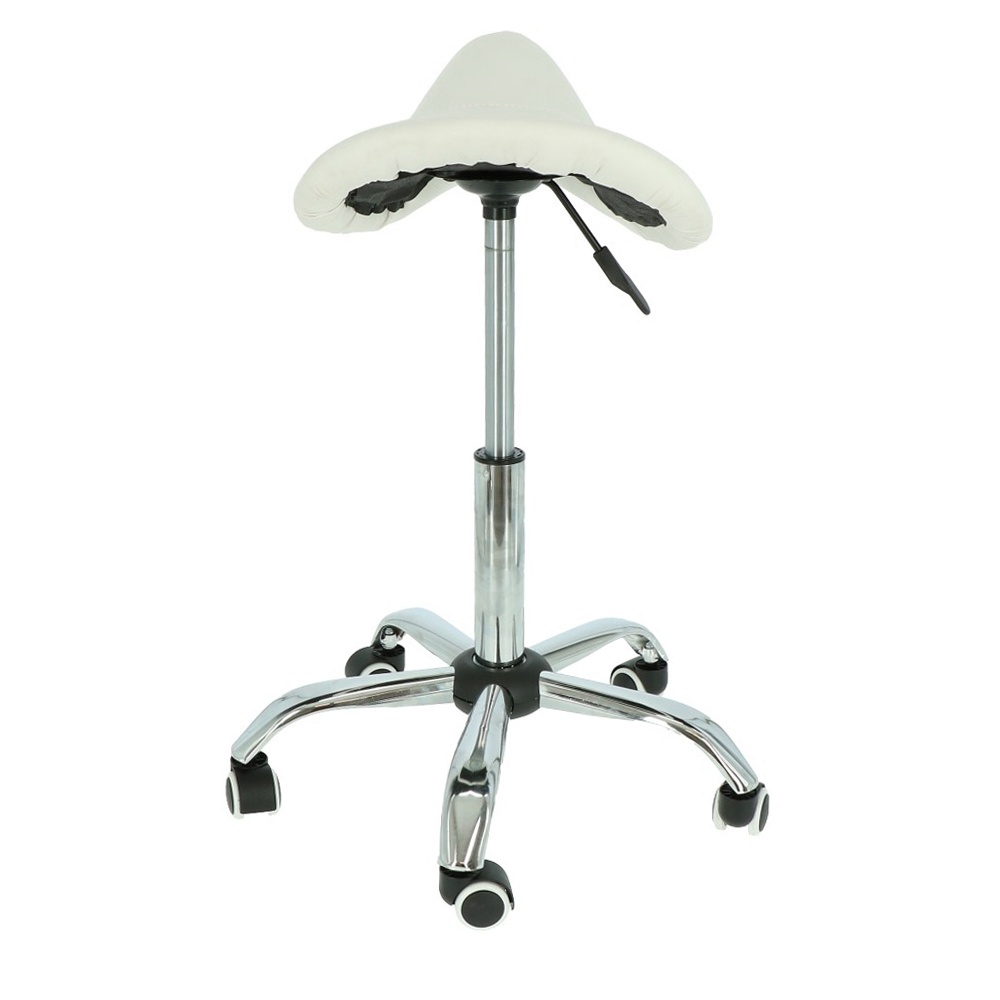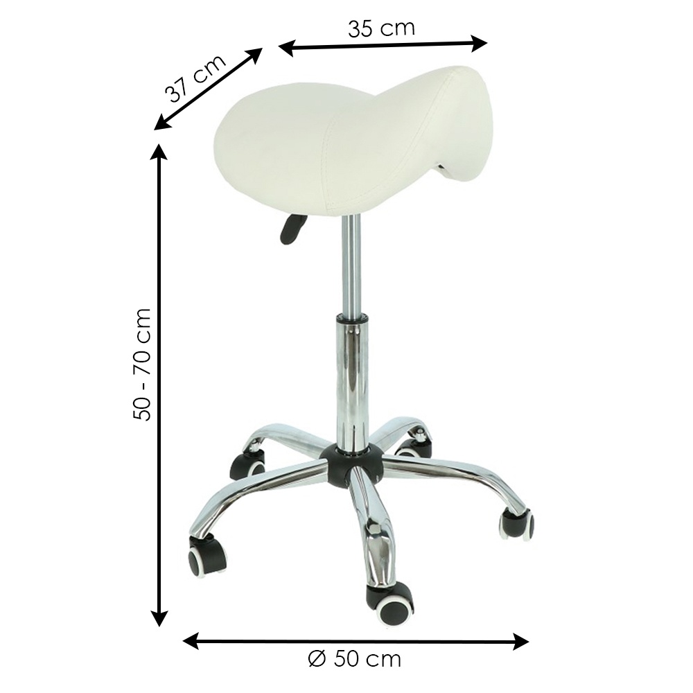 De zadelkruk is voorzien van een stevige foamvulling en bekleed met wit kunstleer voor een luxe uitstraling. Met de hendel onder de zitting pas je de hoogte eenvoudig aan tussen ca. 50 en 70 cm. Perfect voor mensen tot ongeveer 1.90 meter lang. De vijf soepel rollende wielen zorgen ervoor dat je je moeiteloos en zittend kunt verplaatsen – handig én efficiënt.